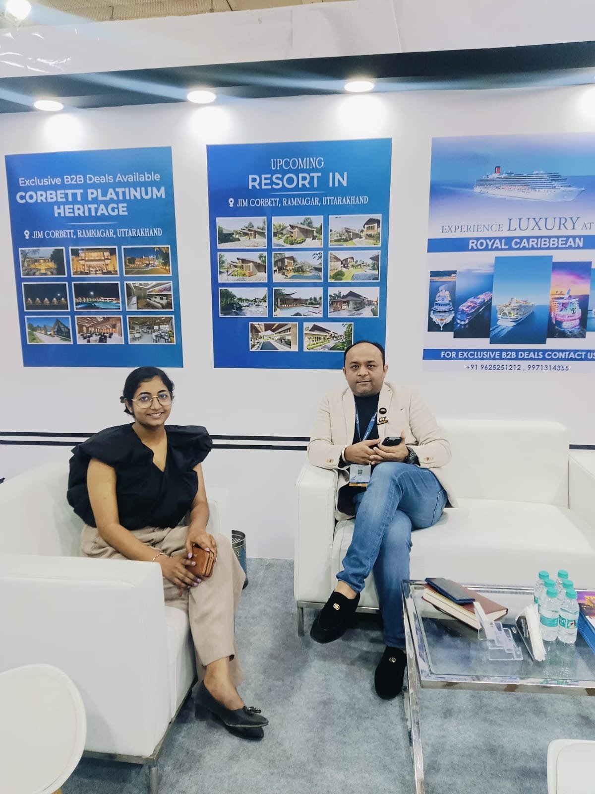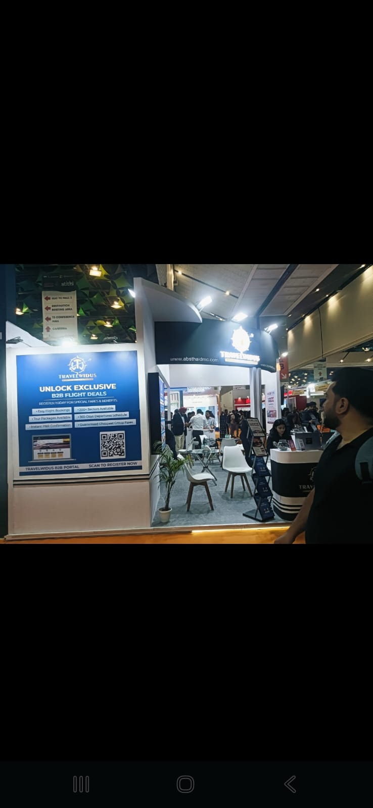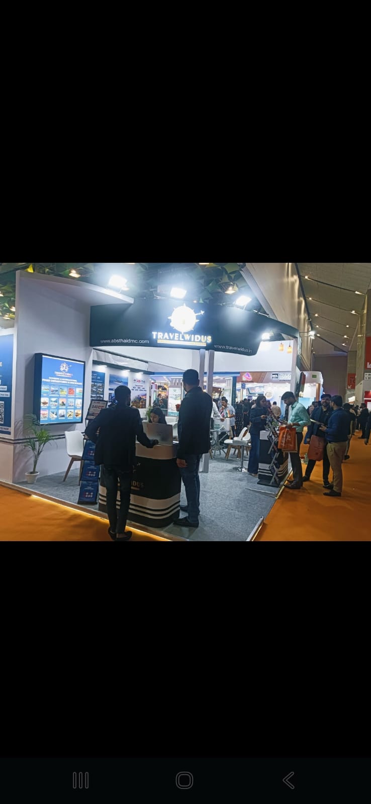Modern, open-layout stall with strong branding, smooth visitor flow, and engaging visuals showcasing travel destinations through vibrant graphics and premium finish. Impactful design earning strong presence at the exhibition.